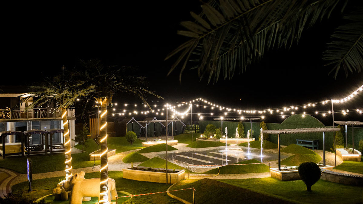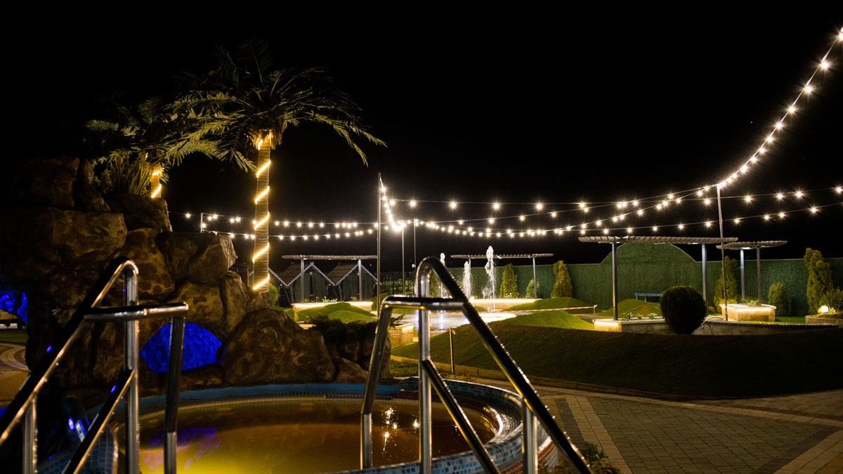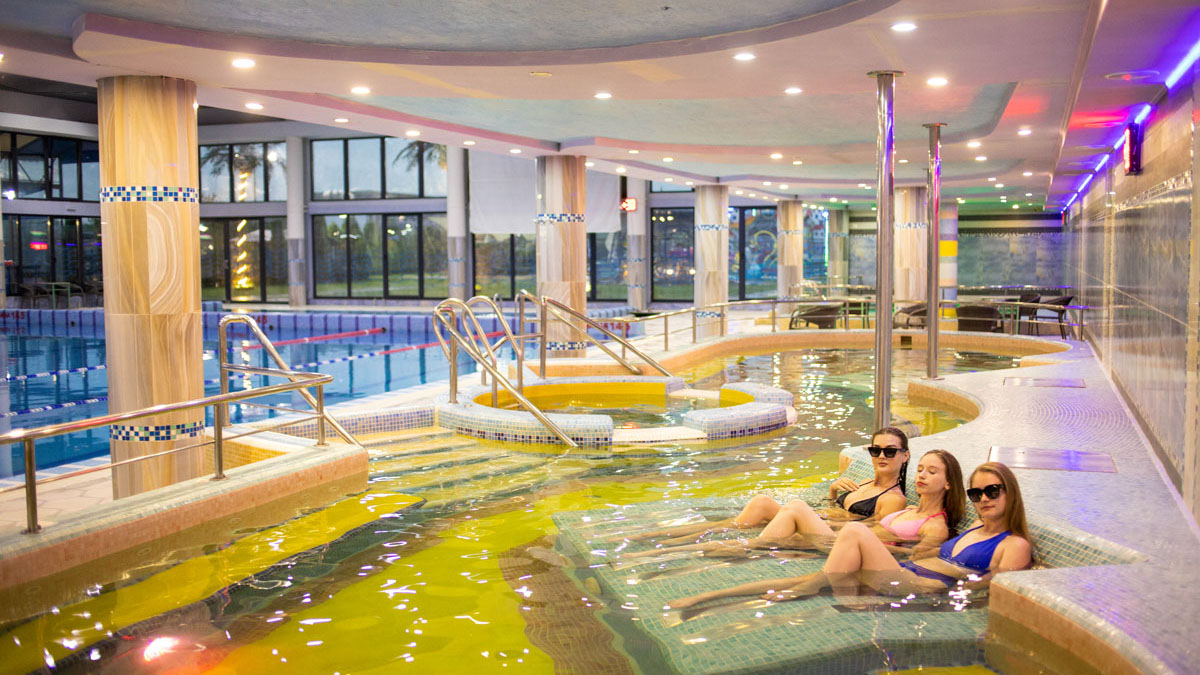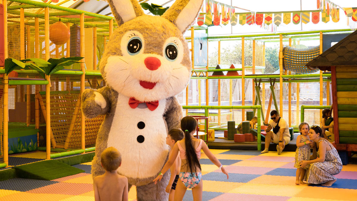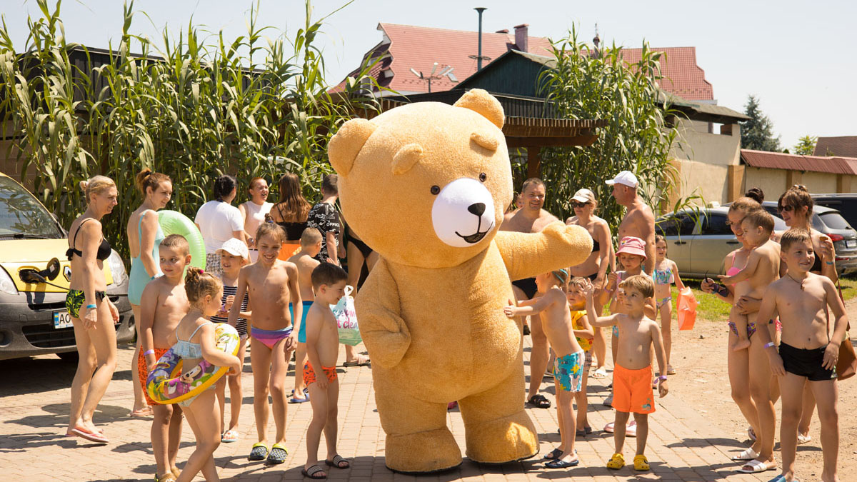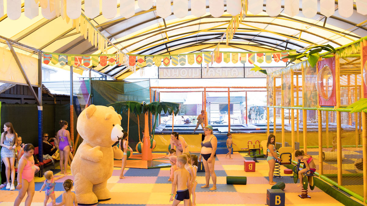 Дитячий басейн із безліччю водних атракціонів: 5 гірок, 2 водяні пушки, 1 величезний водоспад (клоун), три малих цікавих водоспади та 9 фонтанів.