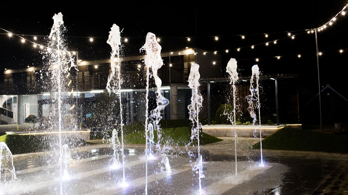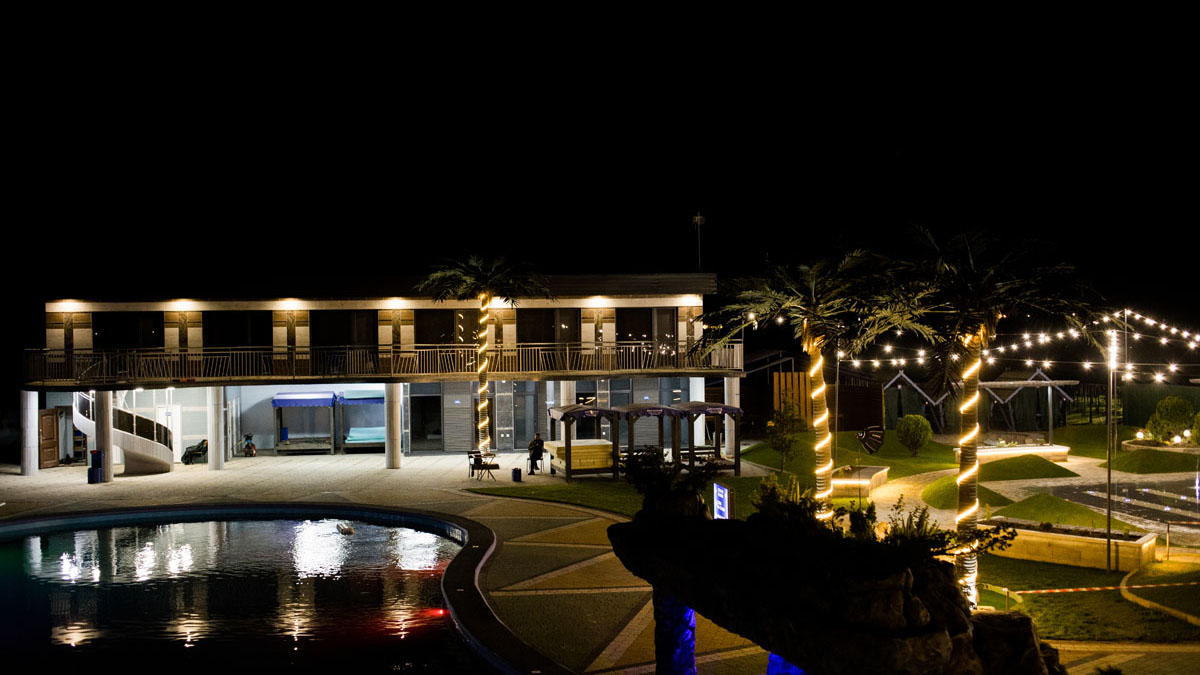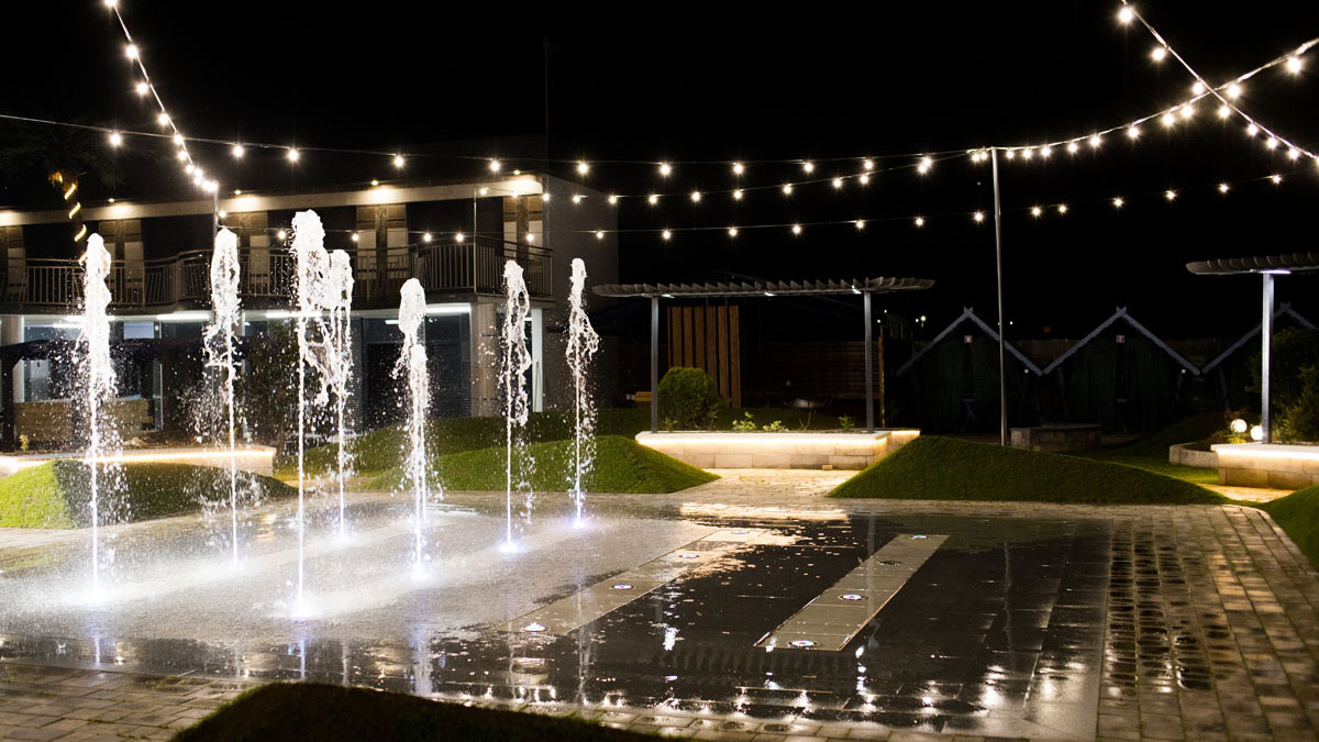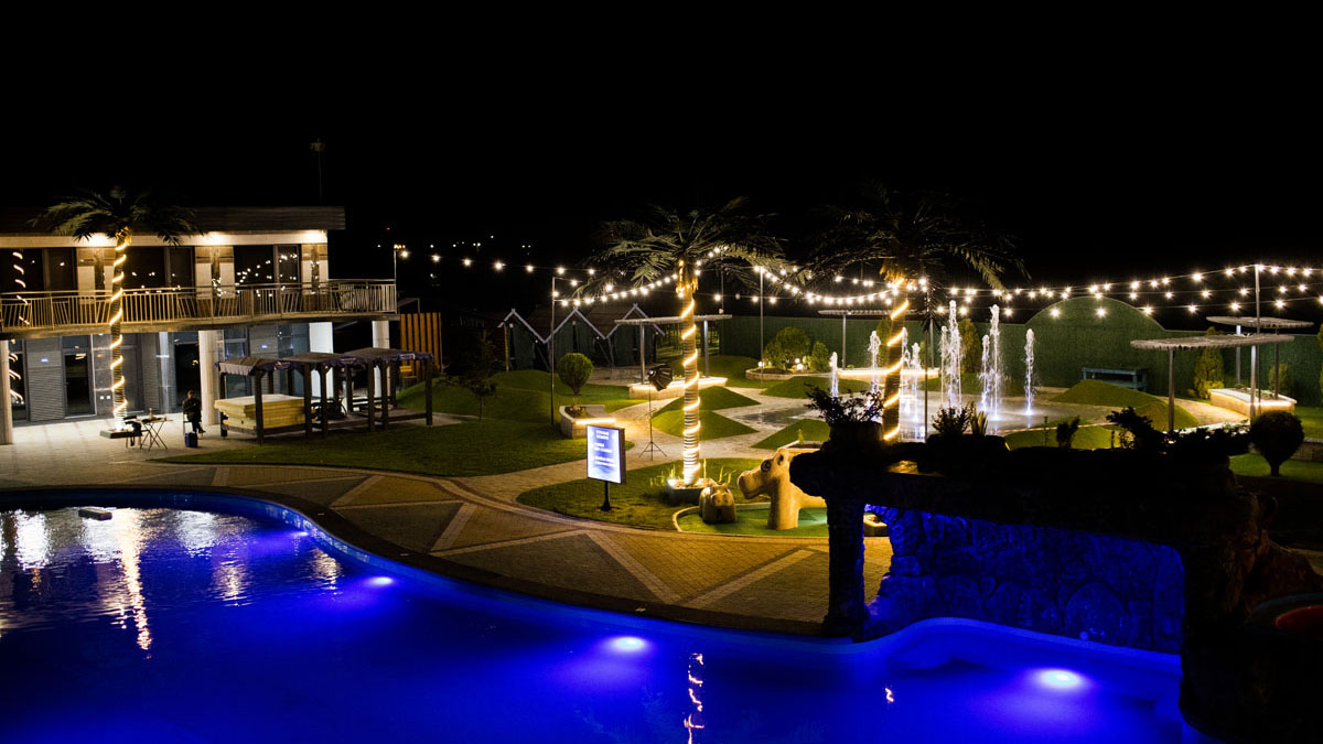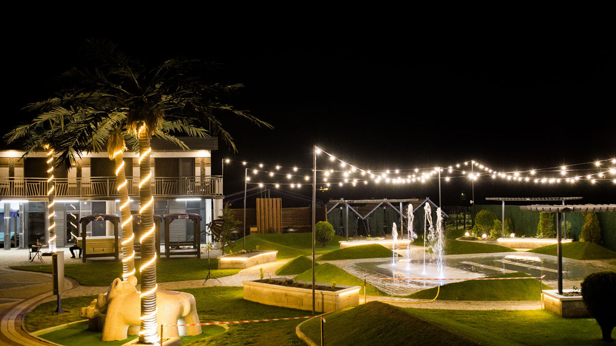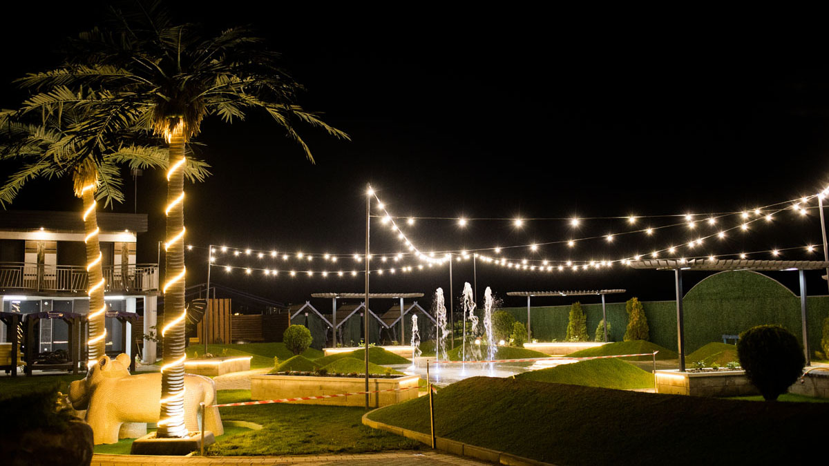 Дитячий басейн із безліччю водних атракціонів: 5 гірок, 2 водяні пушки, 1 величезний водоспад (клоун), три малих цікавих водоспади та 9 фонтанів.